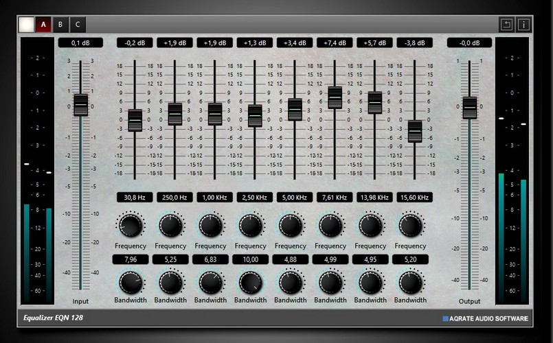 The EQN-128 is a new designed classic stereo equalizer plugin. With 8 Bands and adjustable frequencies plus adjustable bandwidth for each nearly every type of frequency correction is possible.