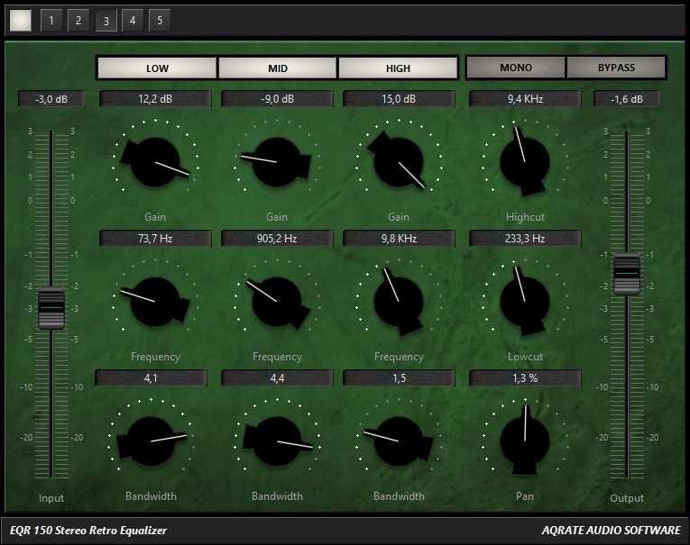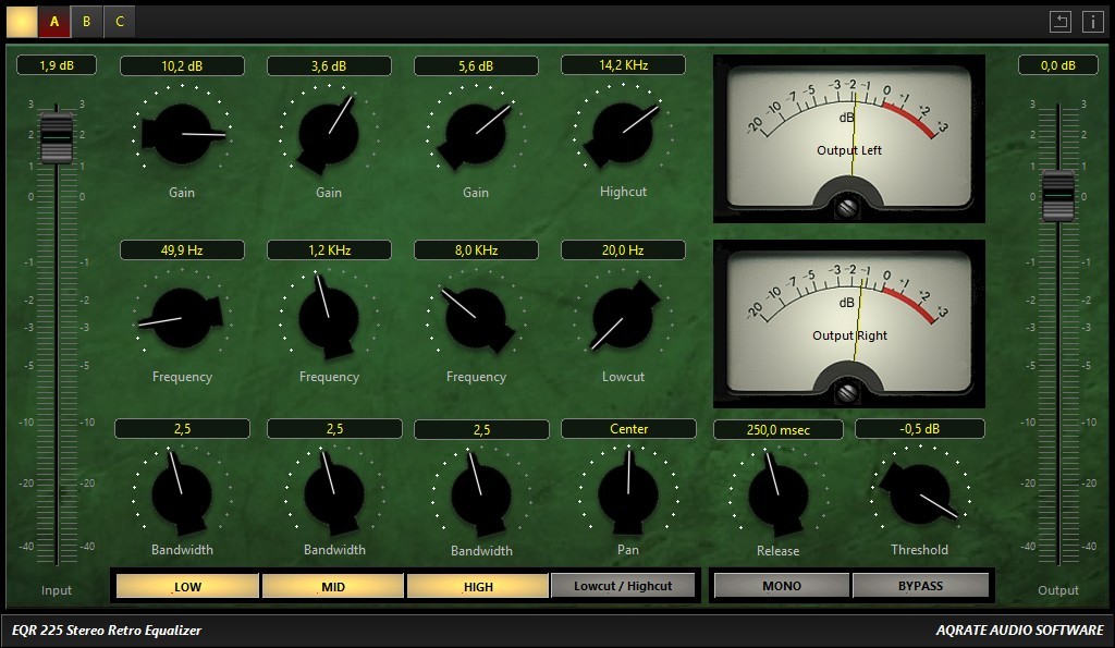 The Retro Equalizer EQR-225 is a combination of a 3-band equalizer and a limiter / compressor, both with a straight tube character. With our new algorithms this little tool creates a very bold and punchy sound by low cpu usage. How much compression you want is adjusted by the input slider. Than more input you give than more compression will be generated.