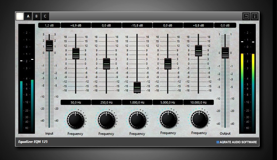The EQN-125 is a new designed classic stereo equalizer plugin. With 5 Bands and adjustable frequencies for each a quick and easy frequency correction is possible.