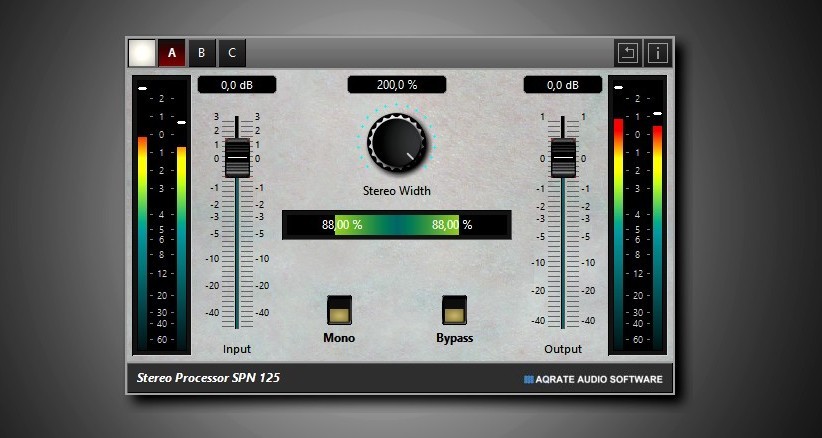 The SPN-125 is a new designed stereo processor plugin that gives the option to adjust the width of the stereo stage of a stereo file from mono to 200% width. The Stereo Meter shows exactly the percentage of each channel.